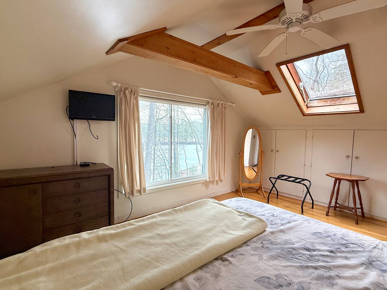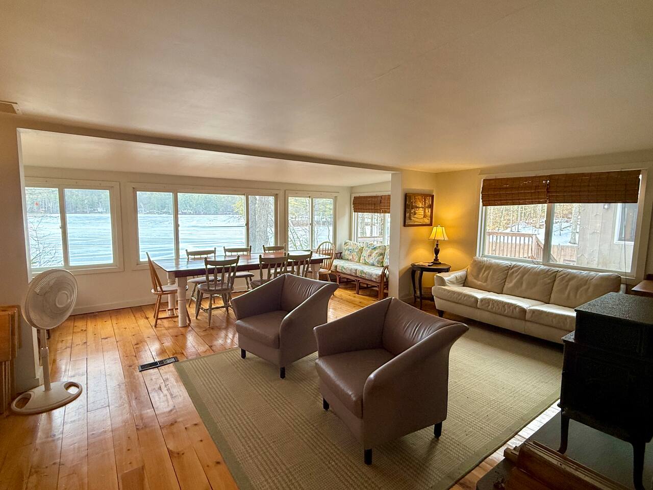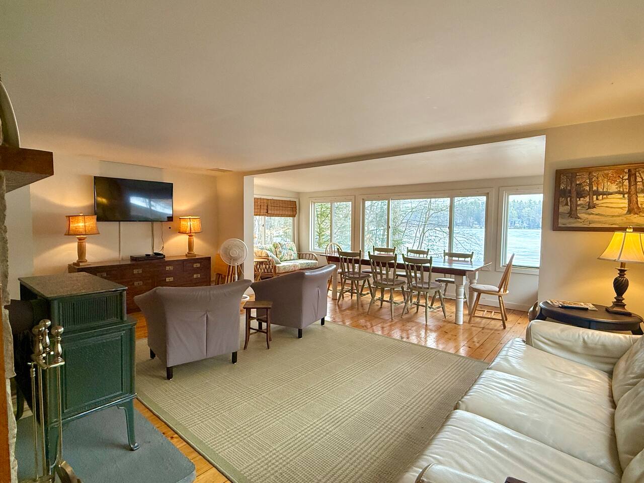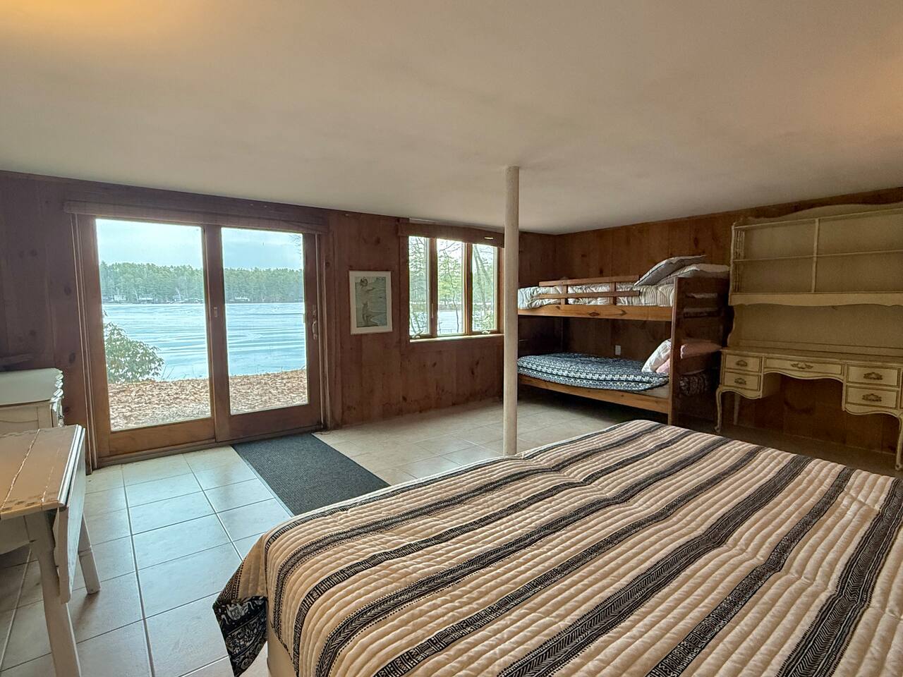 Welcome to your private escape on Mousam Lake! This spacious 3BR/2BA lakefront home offers 150 ft of waterfront, a level yard, and the perfect setting for relaxing and reconnecting. Inside, enjoy a fully stocked kitchen with granite countertops flowing into an open living and dining area with beautiful lake views. The first-floor primary bedroom and full bath offer easy, single-level living, while the second-floor retreat features vaulted ceilings, exposed beams, and peaceful lake views. The walk-out lower level includes a large bunk room with multiple beds and direct access to the waterfront—perfect for kids or groups. Outside, unwind by the firepit, enjoy the gradual shoreline, or spend your days swimming, kayaking, and soaking in the quiet, wooded surroundings. What Guests Love... - 150 ft of private waterfront - Level lot + easy water access - Firepit by the lake - Open-concept living with lake views - Vaulted ceilings + character details - Walk-out lower level bunk room (great for families/groups) - Peaceful, wooded setting