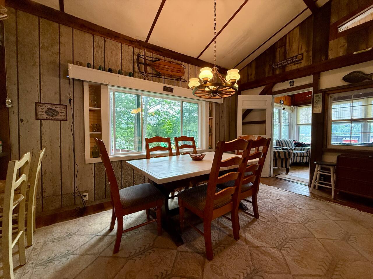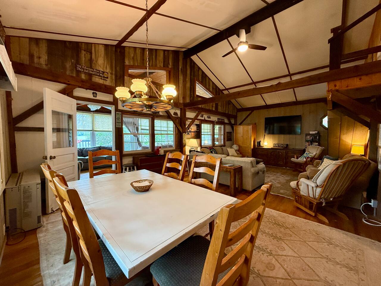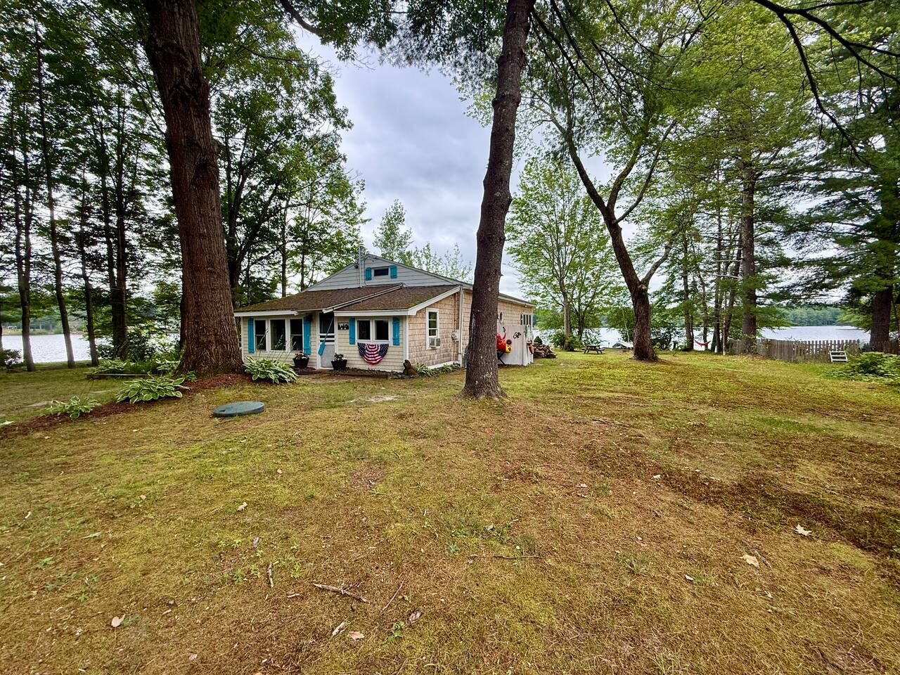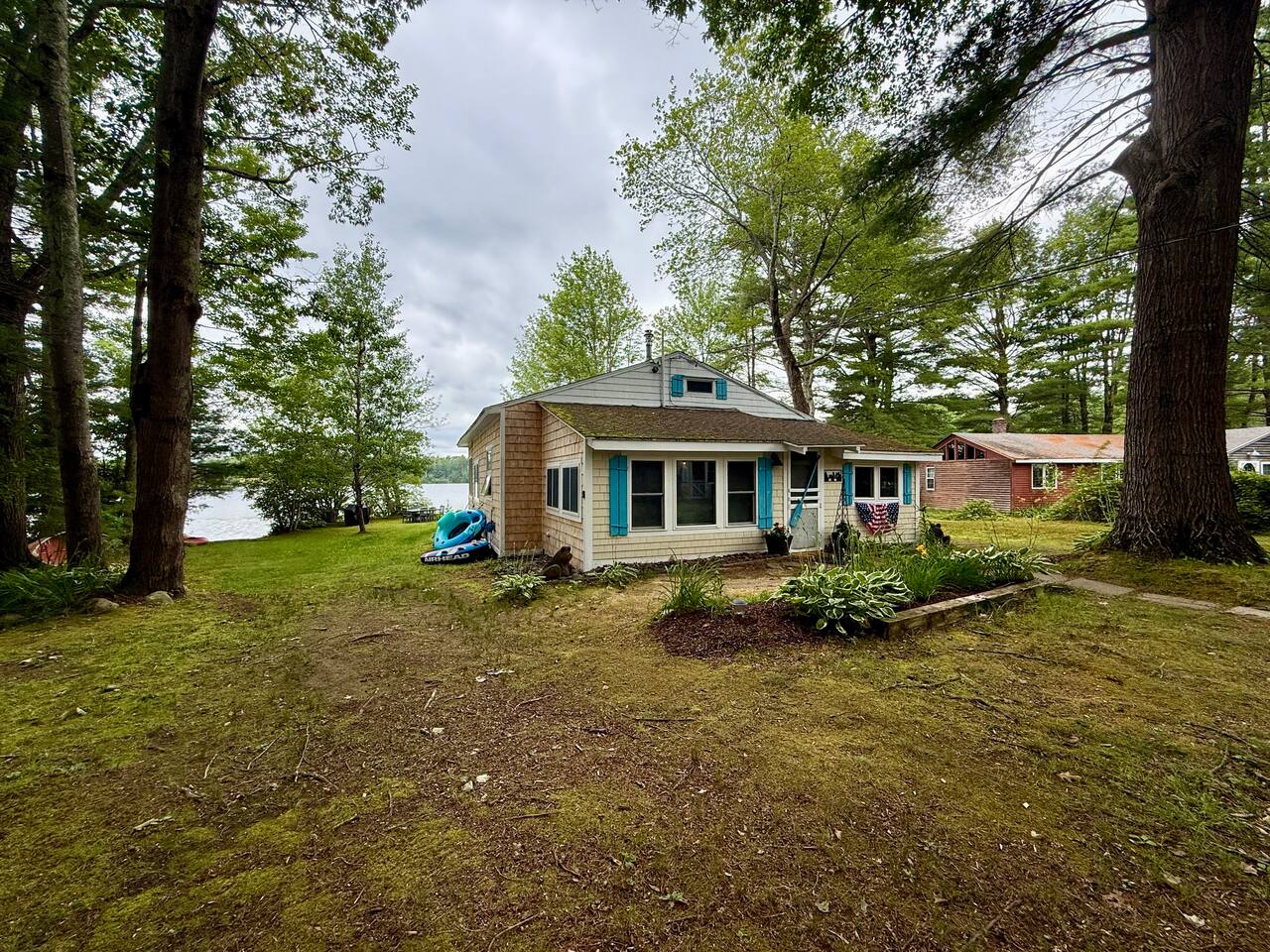 When you first walk into this Rustic Cottage there is a sleeping room which sleeps three - has one bunk bed and a trundle - all twin beds. The trundle bed can be converted to a king bed, if desired. To the right is a bedroom with a Queen Bed. From the bunk room, enter the Kitchen. The Kitchen is fully equipped with all you need to prepare and serve meals. There is no dishwasher. Beyond the kitchen is a dining table with six chairs as well as a large living room with two three seat sofas, a love seat, a rocking chair and a TV. This room has a remote control ceiling fan and light. Right off the kitchen is a 3/4 bath. Bath has a shower - no tub. There is also an outdoor shower. Beyond the bath is a bedroom with a King Bed. This room has a ceiling fan, AC unit, window fan, bureau & closet. Beyond the dining/living area is an awesome porch which has a Queen Pull out Sofa Bed. Porch also has a a leather sofa, a sectional, two comfy upholstered chairs and a table with three chairs. Beyond the porch is an outside deck; the yard features Adirondack chairs, table with six all-weather chairs, and a hammock. Amenities: Nice Dock with ladder Three Kayaks One Canoe One Paddle board Plenty of Life Jackets and Paddles Gas Grill with propane tanks Charcoal Grill Two Picnic tables Fire Pit - please bring your own fire wood Hammock Outdoor Shower Wi-Fi High Speed Cable TV (Spectrum) Roku Two Rinnai Propane heaters Electric Stove Keurig and a brew (Mr. Coffee) coffee maker Ice maker Small beverage fridge on porch Toaster Toaster Oven Blender Lobster Pot Board games & playing cards