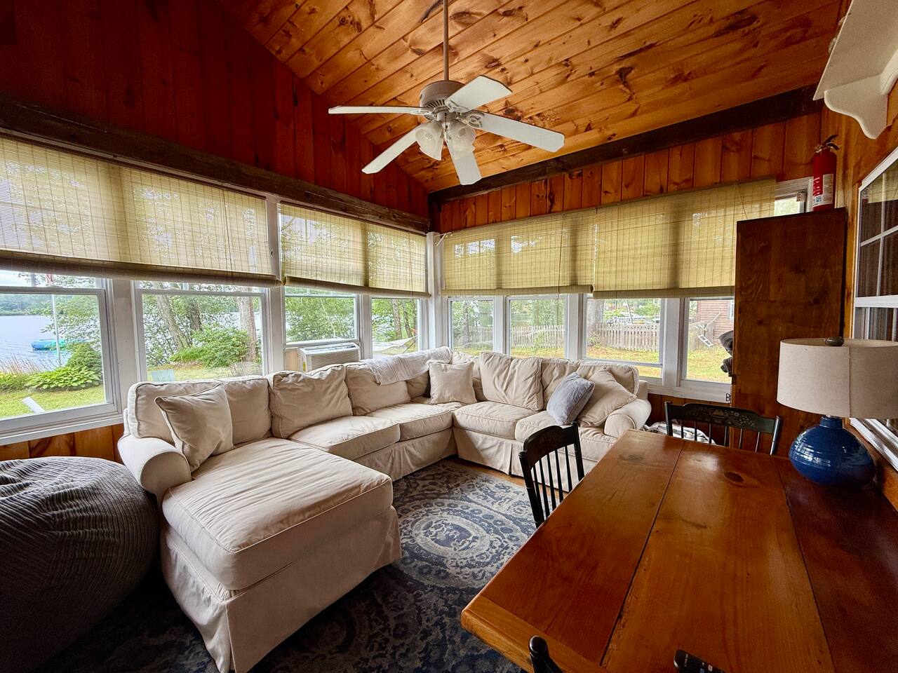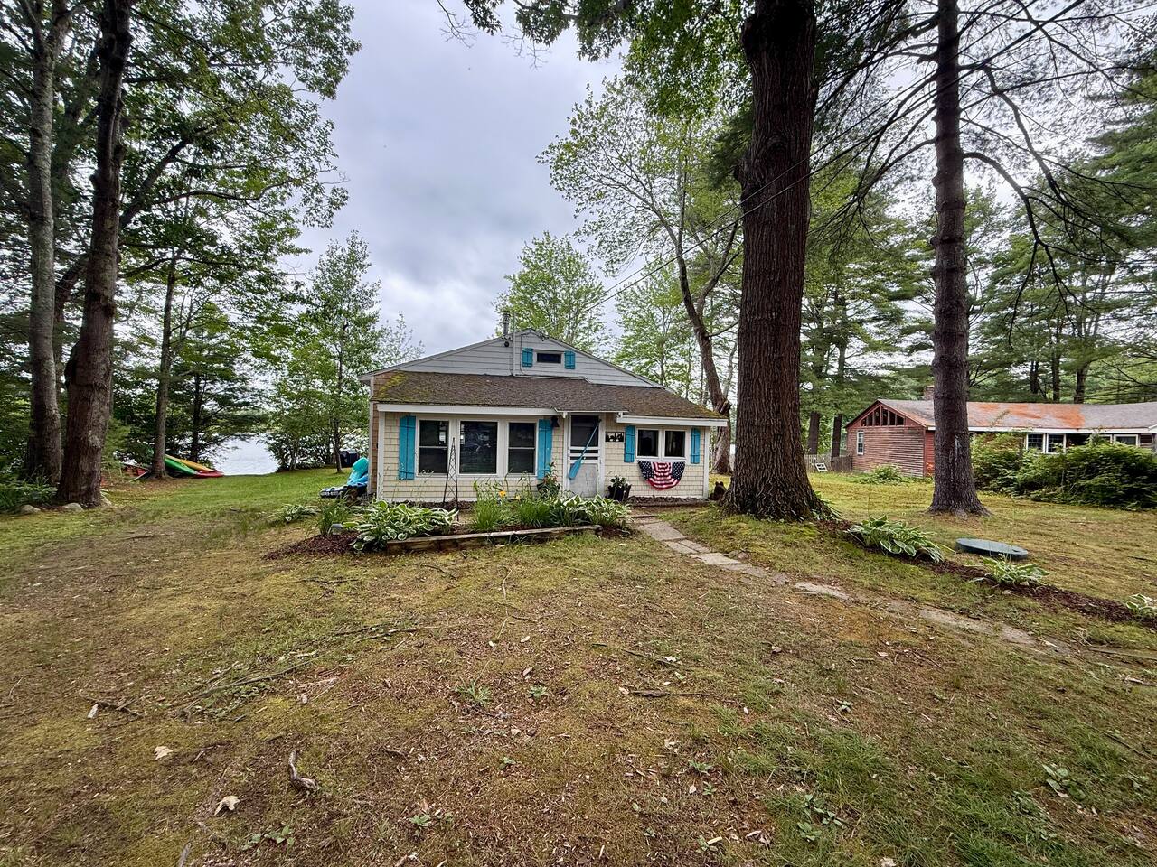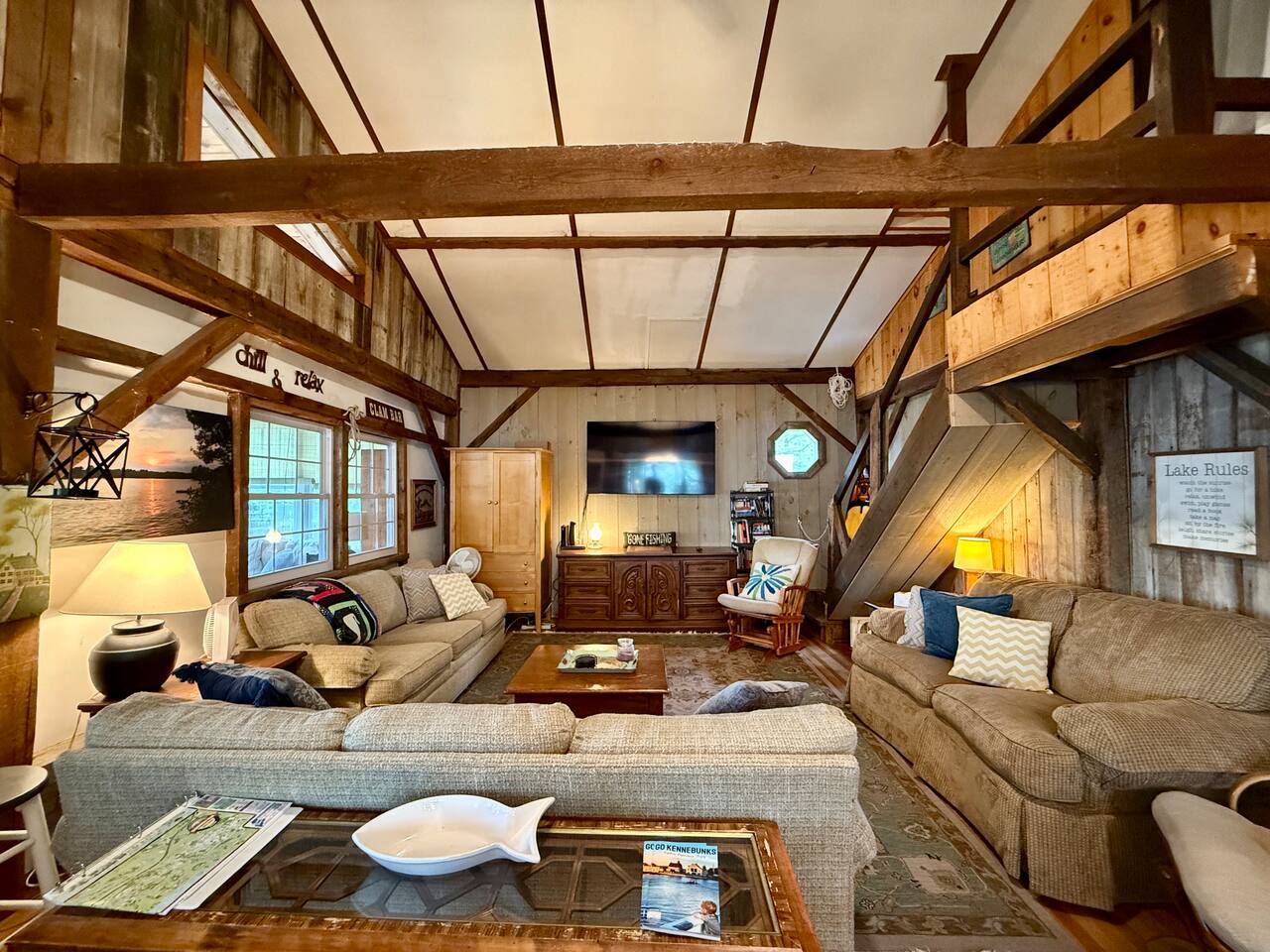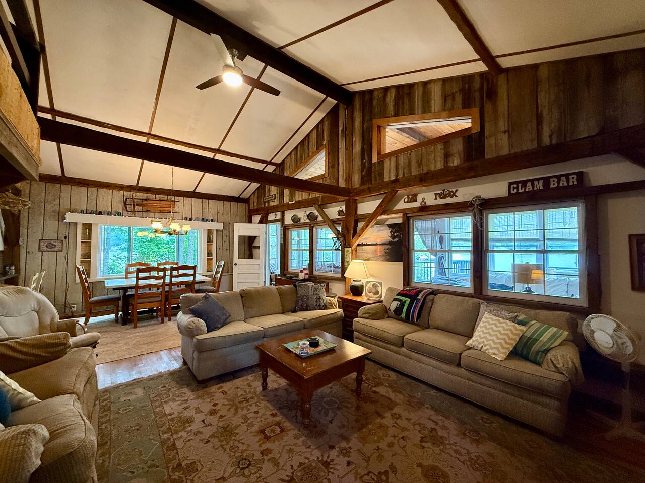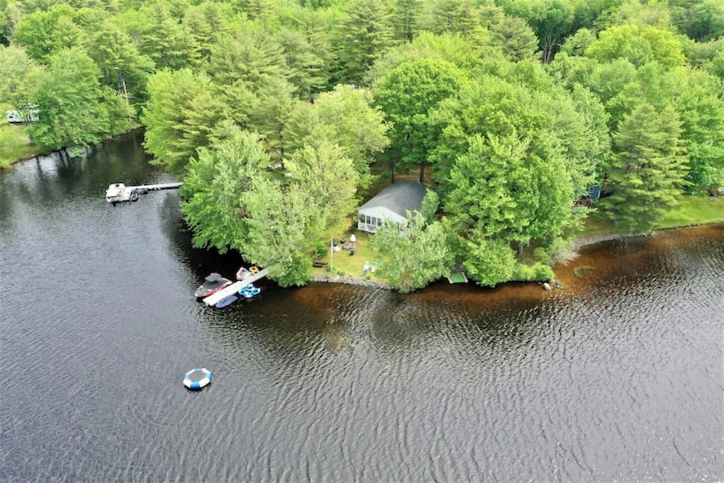 When you first walk into this Rustic Cottage there is a sleeping room which sleeps three - has one bunk bed and a trundle - all twin beds. The trundle bed can be converted to a king bed, if desired. To the right is a bedroom with a Queen Bed. From the bunk room, enter the Kitchen. The Kitchen is fully equipped with all you need to prepare and serve meals. There is no dishwasher. Beyond the kitchen is a dining table with six chairs as well as a large living room with two three seat sofas, a love seat, a rocking chair and a TV. This room has a remote control ceiling fan and light. Right off the kitchen is a 3/4 bath. Bath has a shower - no tub. There is also an outdoor shower. Beyond the bath is a bedroom with a King Bed. This room has a ceiling fan, AC unit, window fan, bureau & closet. Beyond the dining/living area is an awesome porch which has a Queen Pull out Sofa Bed. Porch also has a a leather sofa, a sectional, two comfy upholstered chairs and a table with three chairs. Beyond the porch is an outside deck; the yard features Adirondack chairs, table with six all-weather chairs, and a hammock. Amenities: Nice Dock with ladder Three Kayaks One Canoe One Paddle board Plenty of Life Jackets and Paddles Gas Grill with propane tanks Charcoal Grill Two Picnic tables Fire Pit - please bring your own fire wood Hammock Outdoor Shower Wi-Fi High Speed Cable TV (Spectrum) Roku Two Rinnai Propane heaters Electric Stove Keurig and a brew (Mr. Coffee) coffee maker Ice maker Small beverage fridge on porch Toaster Toaster Oven Blender Lobster Pot Board games & playing cards