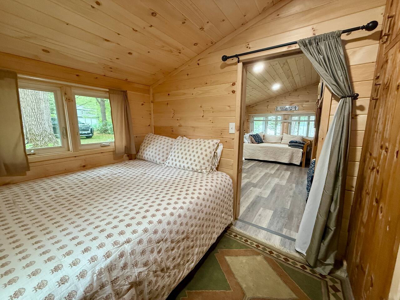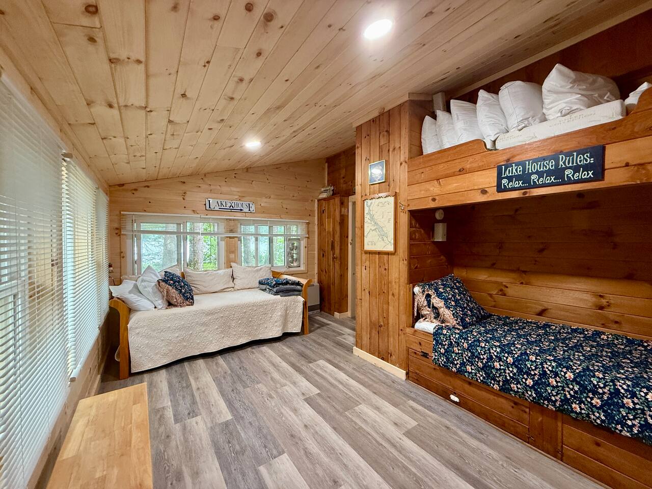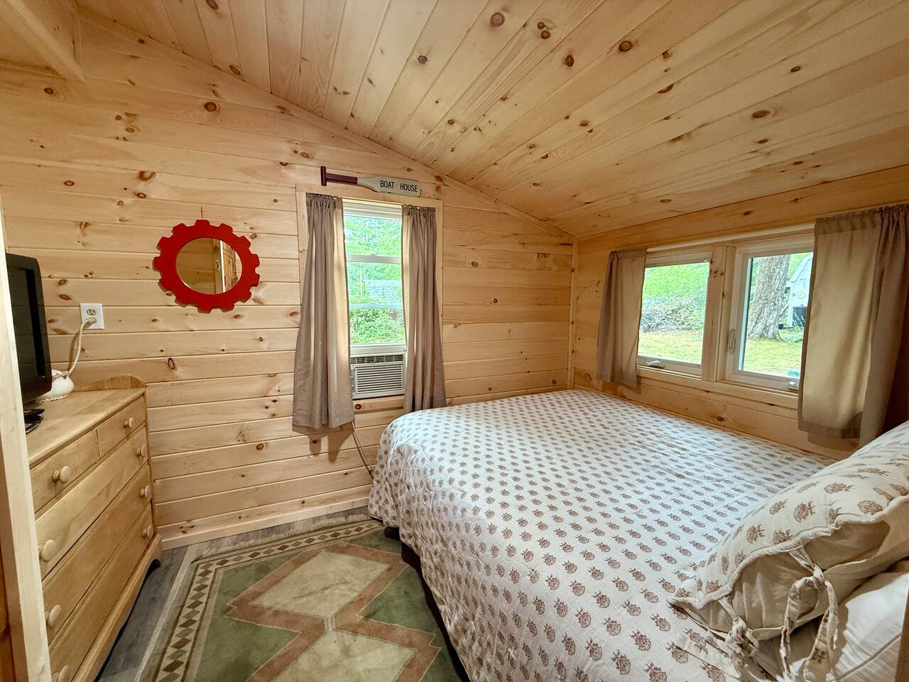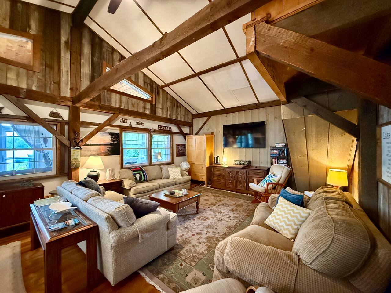 When you first walk into this Rustic Cottage there is a sleeping room which sleeps three - has one bunk bed and a trundle - all twin beds. The trundle bed can be converted to a king bed, if desired. To the right is a bedroom with a Queen Bed. From the bunk room, enter the Kitchen. The Kitchen is fully equipped with all you need to prepare and serve meals. There is no dishwasher. Beyond the kitchen is a dining table with six chairs as well as a large living room with two three seat sofas, a love seat, a rocking chair and a TV. This room has a remote control ceiling fan and light. Right off the kitchen is a 3/4 bath. Bath has a shower - no tub. There is also an outdoor shower. Beyond the bath is a bedroom with a King Bed. This room has a ceiling fan, AC unit, window fan, bureau & closet. Beyond the dining/living area is an awesome porch which has a Queen Pull out Sofa Bed. Porch also has a a leather sofa, a sectional, two comfy upholstered chairs and a table with three chairs. Beyond the porch is an outside deck; the yard features Adirondack chairs, table with six all-weather chairs, and a hammock. Amenities: Nice Dock with ladder Three Kayaks One Canoe One Paddle board Plenty of Life Jackets and Paddles Gas Grill with propane tanks Charcoal Grill Two Picnic tables Fire Pit - please bring your own fire wood Hammock Outdoor Shower Wi-Fi High Speed Cable TV (Spectrum) Roku Two Rinnai Propane heaters Electric Stove Keurig and a brew (Mr. Coffee) coffee maker Ice maker Small beverage fridge on porch Toaster Toaster Oven Blender Lobster Pot Board games & playing cards