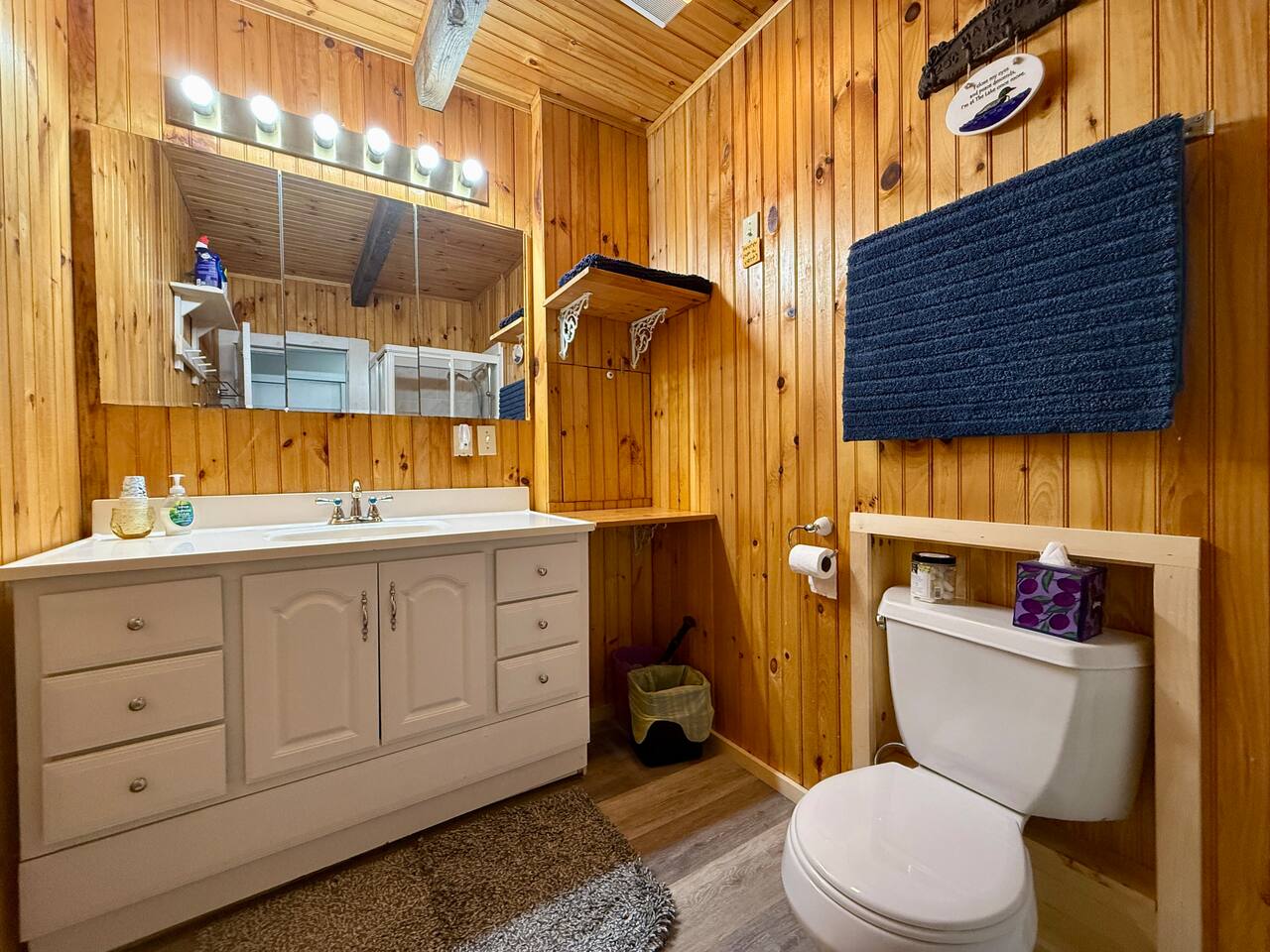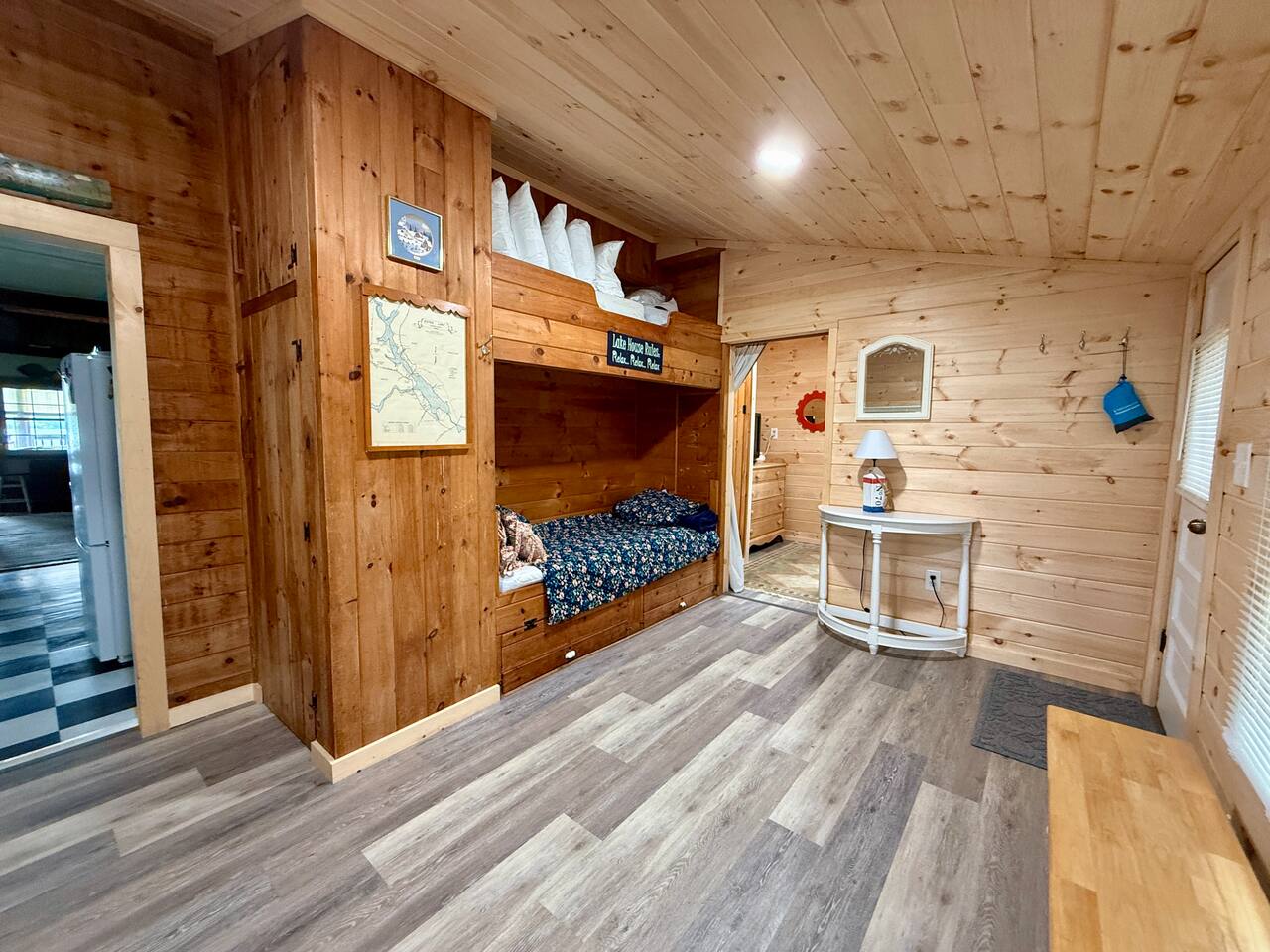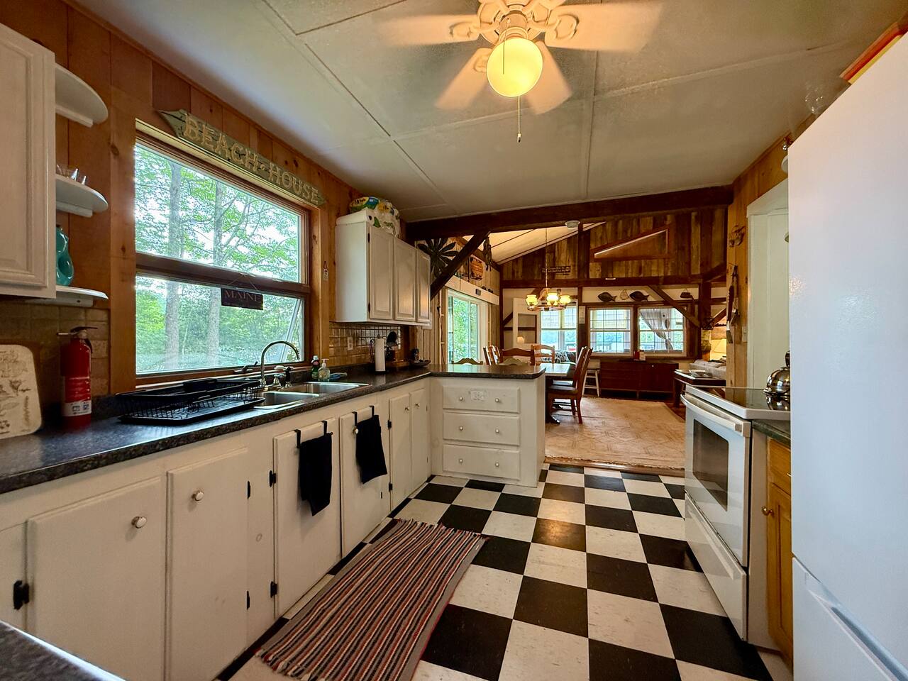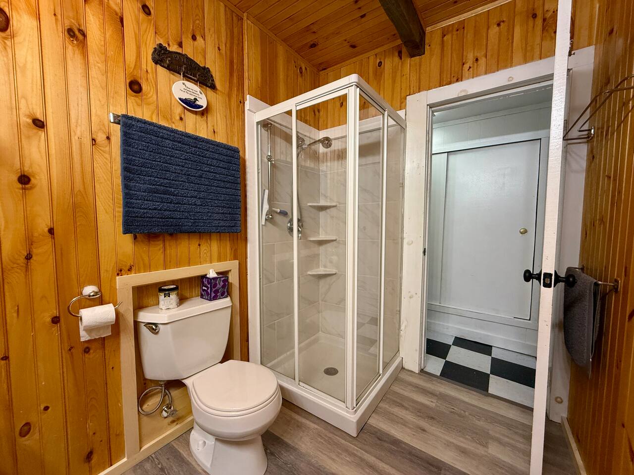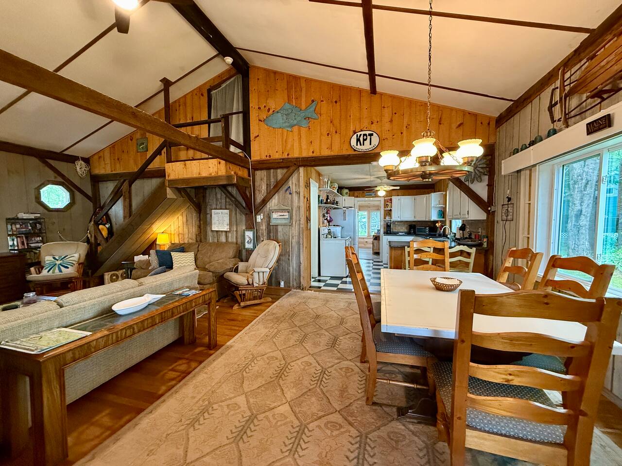 When you first walk into this Rustic Cottage there is a sleeping room which sleeps three - has one bunk bed and a trundle - all twin beds. The trundle bed can be converted to a king bed, if desired. To the right is a bedroom with a Queen Bed. From the bunk room, enter the Kitchen. The Kitchen is fully equipped with all you need to prepare and serve meals. There is no dishwasher. Beyond the kitchen is a dining table with six chairs as well as a large living room with two three seat sofas, a love seat, a rocking chair and a TV. This room has a remote control ceiling fan and light. Right off the kitchen is a 3/4 bath. Bath has a shower - no tub. There is also an outdoor shower. Beyond the bath is a bedroom with a King Bed. This room has a ceiling fan, AC unit, window fan, bureau & closet. Beyond the dining/living area is an awesome porch which has a Queen Pull out Sofa Bed. Porch also has a a leather sofa, a sectional, two comfy upholstered chairs and a table with three chairs. Beyond the porch is an outside deck; the yard features Adirondack chairs, table with six all-weather chairs, and a hammock. Amenities: Nice Dock with ladder Three Kayaks One Canoe One Paddle board Plenty of Life Jackets and Paddles Gas Grill with propane tanks Charcoal Grill Two Picnic tables Fire Pit - please bring your own fire wood Hammock Outdoor Shower Wi-Fi High Speed Cable TV (Spectrum) Roku Two Rinnai Propane heaters Electric Stove Keurig and a brew (Mr. Coffee) coffee maker Ice maker Small beverage fridge on porch Toaster Toaster Oven Blender Lobster Pot Board games & playing cards