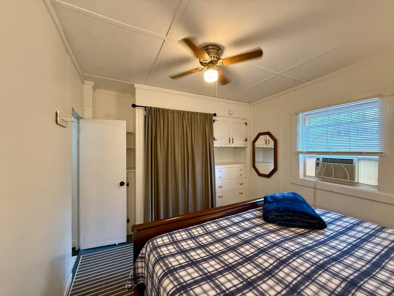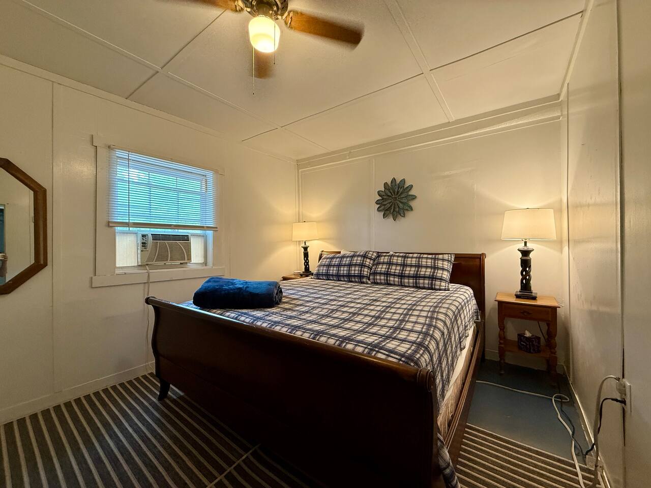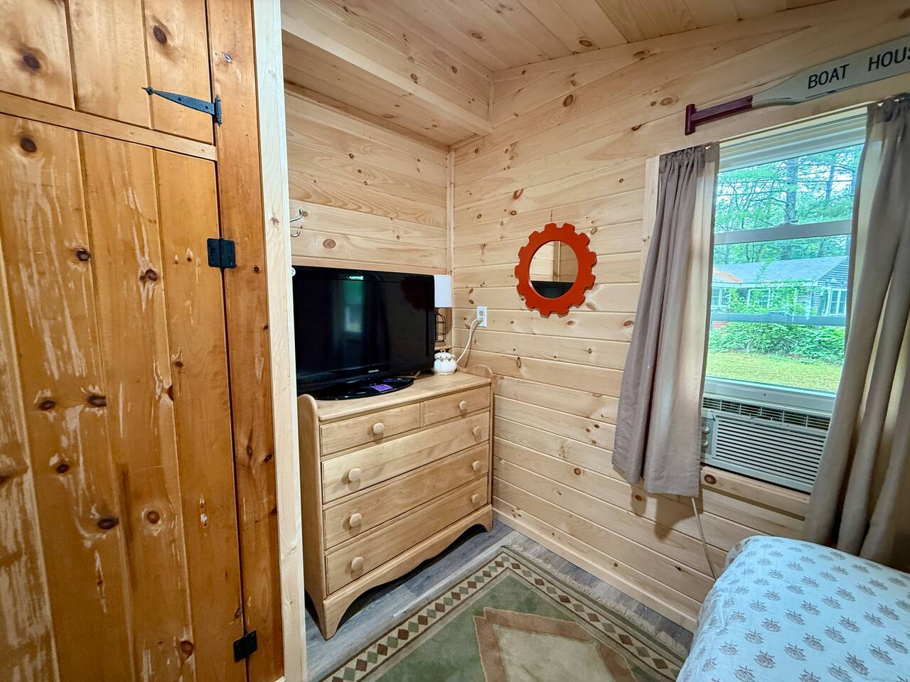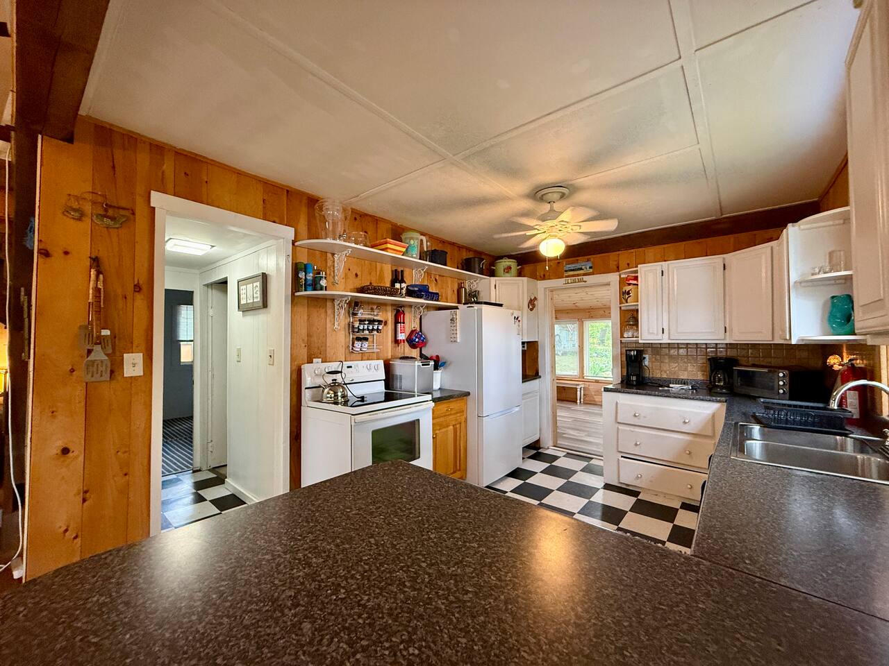 When you first walk into this Rustic Cottage there is a sleeping room which sleeps three - has one bunk bed and a trundle - all twin beds. The trundle bed can be converted to a king bed, if desired. To the right is a bedroom with a Queen Bed. From the bunk room, enter the Kitchen. The Kitchen is fully equipped with all you need to prepare and serve meals. There is no dishwasher. Beyond the kitchen is a dining table with six chairs as well as a large living room with two three seat sofas, a love seat, a rocking chair and a TV. This room has a remote control ceiling fan and light. Right off the kitchen is a 3/4 bath. Bath has a shower - no tub. There is also an outdoor shower. Beyond the bath is a bedroom with a King Bed. This room has a ceiling fan, AC unit, window fan, bureau & closet. Beyond the dining/living area is an awesome porch which has a Queen Pull out Sofa Bed. Porch also has a a leather sofa, a sectional, two comfy upholstered chairs and a table with three chairs. Beyond the porch is an outside deck; the yard features Adirondack chairs, table with six all-weather chairs, and a hammock. Amenities: Nice Dock with ladder Three Kayaks One Canoe One Paddle board Plenty of Life Jackets and Paddles Gas Grill with propane tanks Charcoal Grill Two Picnic tables Fire Pit - please bring your own fire wood Hammock Outdoor Shower Wi-Fi High Speed Cable TV (Spectrum) Roku Two Rinnai Propane heaters Electric Stove Keurig and a brew (Mr. Coffee) coffee maker Ice maker Small beverage fridge on porch Toaster Toaster Oven Blender Lobster Pot Board games & playing cards